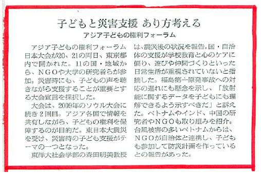 朝日新聞 2011年11月30日 朝刊にアジア子どもの権利フォーラムの記事が掲載され、山田町ゾンタハウスのことが取り上げられています。