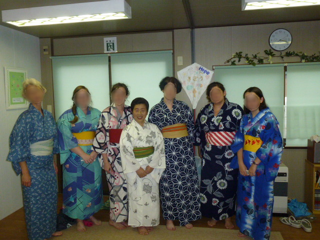 7月31日の「郁子のゆかた着付け教室」での散歩で少し離れた場所にある、交流スペース「いっぽいっぽ」さんに行きたまたまボランティアに来ていた外国の方にゆかたの着付けを教える事になりました。みんな、初めてのゆかたで興奮でした。着る物は洋服と違うけど、帯の締め方をお互いに見せ合ったりとこういう乙女心は万国共通なんですね。